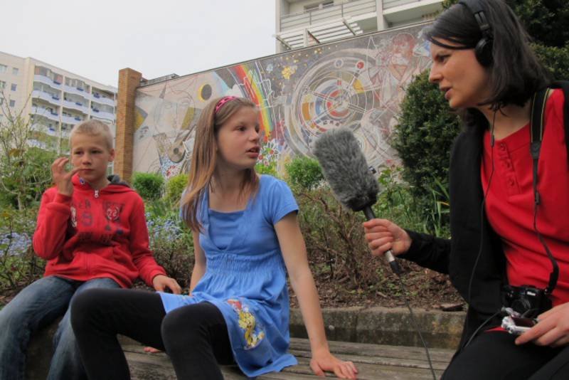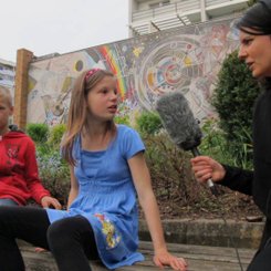 Die Stadtentdecker_innen interviewen Leute auf der Straße, legen