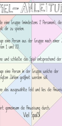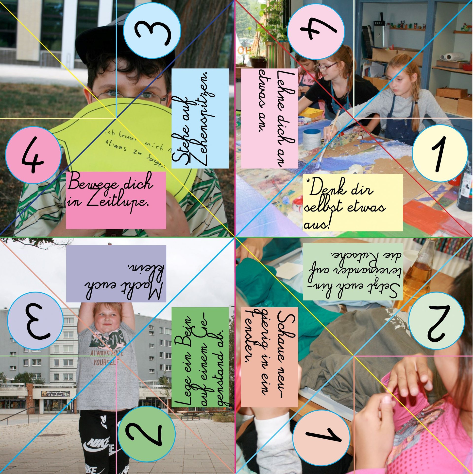Im Verlaufe dieser zehn Termine entstand das „Schnappi- Spiel“, welches schriftliche Aufforderungen zur Bewegung im öffentlichen Raum beinhaltet. Dieses Spiel wurde bei dem Abschlusstermin am 28.10.2019 vor dem FAIR an die Kinder, Passanten oder Familienangehörige ausgehändigt und diese wurden somit aufgefordert selbst zu spielen!
