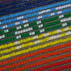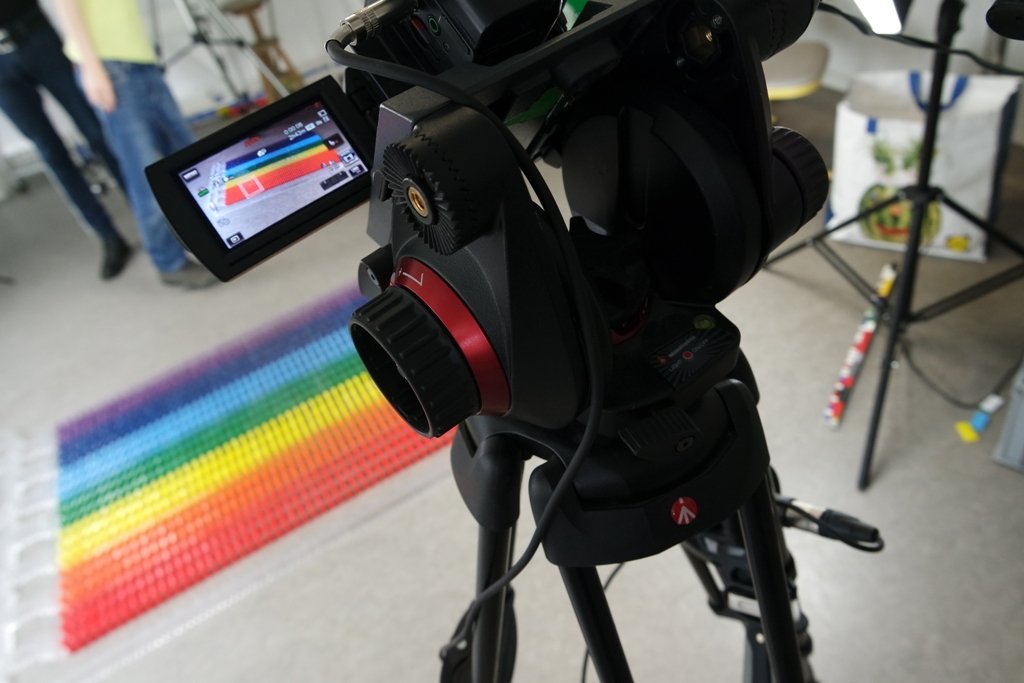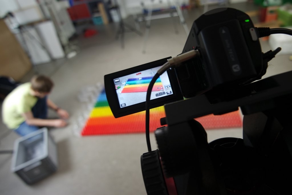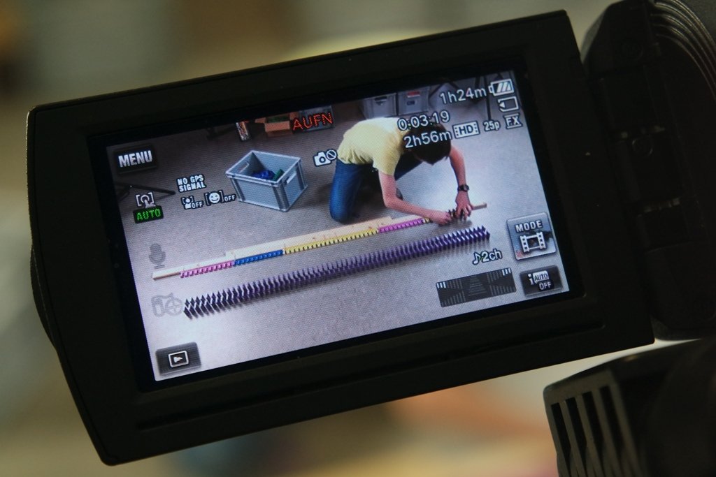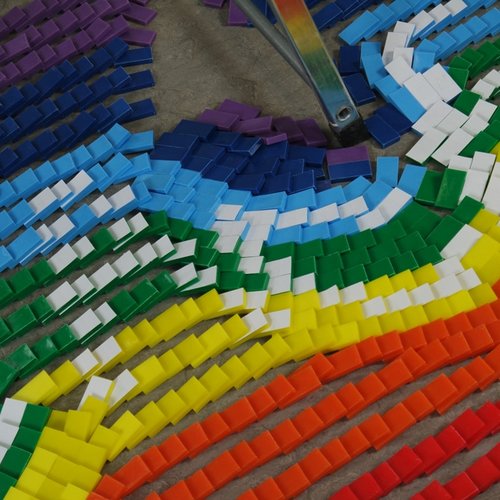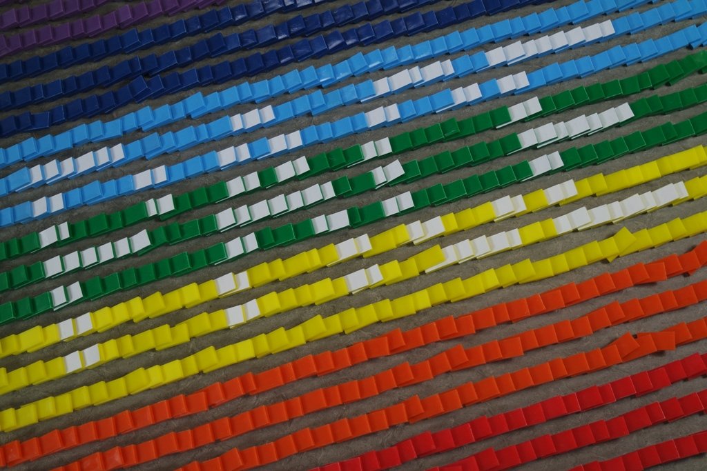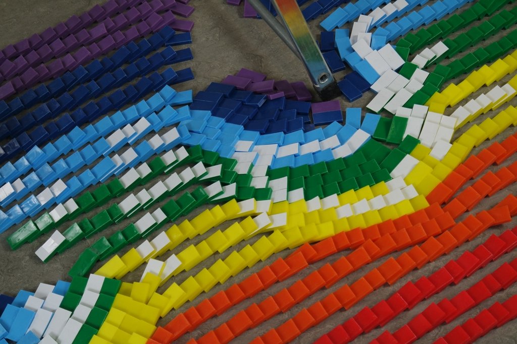 Eine Regenbogenfahne als Dominoinstallation war unsere Idee. Es war beeindruckend, wie es Tobias vermochte, die Steine behände aufzustellen. Reihe für Reihe: Violett, Königsblau, Türkis, Grün, Gelb, Orange, Rot. Tobias ließ sich auch nicht entmutigen, nachdem die erste Kette nicht funktioniert hatte. Er baute alle Steine noch einmal auf. Am Ende waren alle Beobachter*innen begeistert, die Steine kamen nach Farben sortiert in ihre Behälter zurück und Tobias wurde nach Hause gebracht. 1.650 Dominosteine aus Plastik.